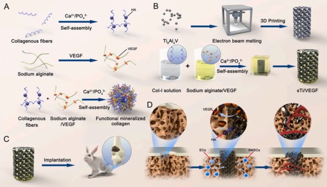 材料设计:该研究设计了一种功能化的仿生矿化胶原(FMC)材料,其中加入了海藻酸钠(SA)和血管内皮生长因子(VEGF)。FMC材料不仅具有良好的机械强度,还能够持续释放生长因子以促进骨和血管的再生。通过将FMC材料填充到3D打印的钛合金支架的微孔中,形成一种新的有机-无机生物活性界面。随着FMC的持续降解,周围环境中的骨髓间充质干细胞(BMSCs)和血管内皮细胞(VECs)被吸引到支架表面,促进骨和血管的再生。