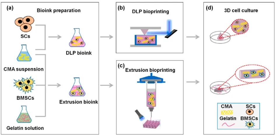 7.0)下进行甲基丙烯酸化处理,以提高其生物相容性和打印性能。CMA生物墨水具有良好的光固化特性,可与Schwann细胞(SCs)和骨髓间充质干细胞(BMSCs)相结合,适用于数字光处理(DLP)和挤出式生物打印。与传统的甲基丙烯酸化明胶(GelMA)相比,CMA保留了胶原特有的三螺旋分子结构,促进细胞与基质之间的信号传递和相互作用。