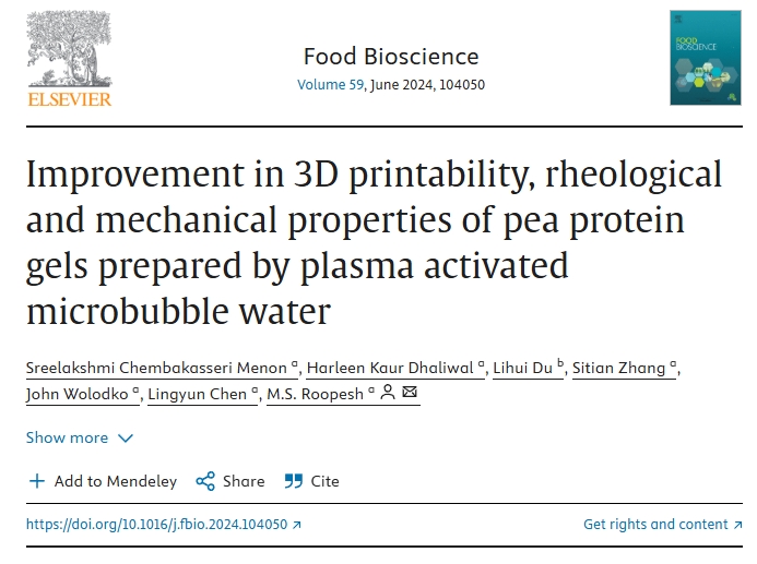 该研究是基于先前由ALES教授Lingyun Chen合作启动的实验,并由前博士生Sitian Zhang开发。目前,研究人员已对这项技术提出了专利申请。这项基础研究为创造更广泛的高质量3D打印蛋白质来源和其它生物材料铺平了道路。结合冷等离子体技术和3D打印等新技术,有潜力为农作物生产者和食品行业带来显著的价值增加。相关研究得到了加拿大自然科学与工程研究委员会基金、合作研究与培训经验计划以及阿尔伯塔创新基金会的资助。