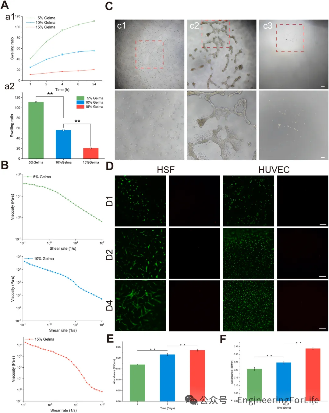研究评估了GelMA水凝胶的理化性能与细胞相容性。溶胀实验表明低浓度水凝胶吸液能力更优,而流变学测试显示其剪切稀化特性利于生物打印。10%