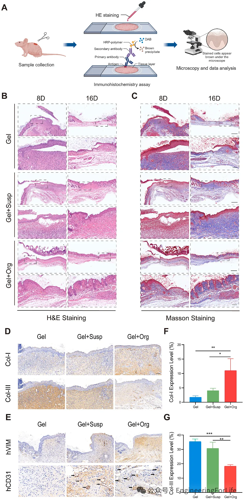 H&E染色显示,类器官组术后16天表皮-真皮连接紧密,炎症细胞浸润显著少于凝胶组与细胞悬液组,且新生皮肤出现类似毛囊的结构。Masson染色证实类器官组真皮层胶原纤维排列有序,而对照组纤维松散。免疫组化显示类器官组I型胶原表达量最高、III型胶原最少,表明其通过优化胶原比例减少瘢痕形成。此外,类器官组血管密度显著提升,并检测到人源特异性标记物hVIM与hCD31的高表达,证实其促进功能性皮肤再生。该技术通过仿生结构重建与基质调控,实现接近正常皮肤的高质量愈合。