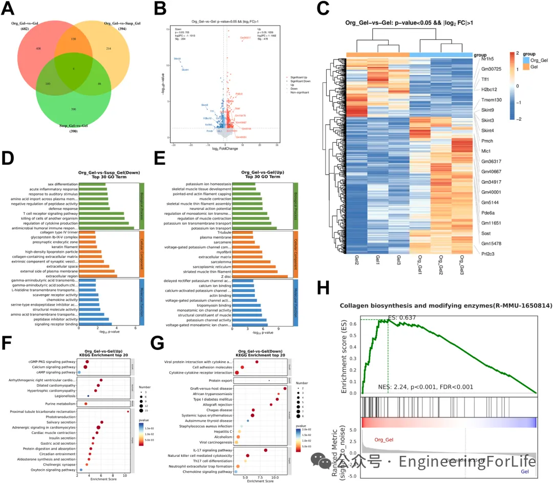 为了揭示生物3D打印皮肤类器官的促愈机制,该研究进行了转录组学分析。与对照组相比,类器官组差异表达基因显著富集,其中478个基因上调、204个下调。GO分析显示其下调T细胞受体信号通路与体液免疫应答,减少炎症反应;同时上调细胞外基质合成相关基因,促进胶原重塑。KEGG通路分析证实其通过抑制IL-17、NK细胞毒性等促炎通路,并激活cGMP-PKG信号,协同调控炎症微环境与再生进程,从而加速伤口闭合。
