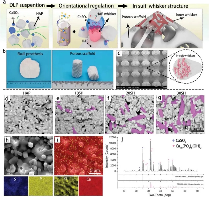 SH),其显微组织如图1d-g所示。EDS和XRD表明该材料仅由CaSO4和HAP晶体组成,并确定生成的晶须为HAP(图1h-j)。