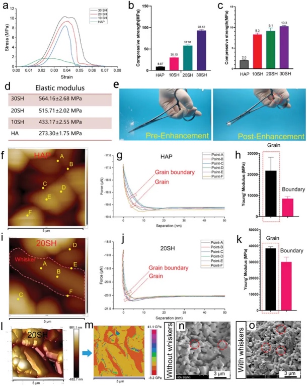 为了了解原位晶须结构对陶瓷力学性能的影响,研究者3D打印了孔隙率为68%的固体陶瓷和多孔陶瓷进行了压缩测试(图2a-d)。多孔陶瓷的应力-应变曲线表明,所有支架都表现为脆性断裂,即材料破坏后应力迅速下降。利用原子力显微镜(AFM)进一步研究了材料的纳米力学性能,在原子力显微镜下,HAP和20SH样品在晶粒和晶界上的三个不同点上测量了力-位移曲线(图2f-m)。晶体内的杨氏模量明显高于晶界处的杨氏模量。材料的纳米力学图证实了陶瓷晶粒位置的力大于晶界处的力。断口形貌表明,晶须增强陶瓷具有沿晶和沿晶两种断裂模式,而纯HAP陶瓷仅表现为沿晶断裂(图2n-o)。