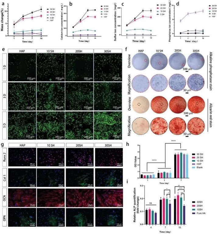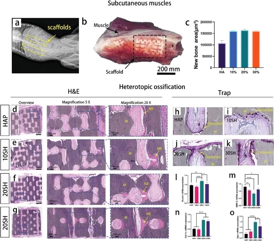 SH样品的Runx2、Col1、骨钙素(OCN)和骨桥蛋白(OPN)均高度表达(图4g)。