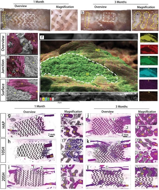 SH和HAP)植入小猎犬椎旁肌肉3个月,观察成骨现象(图6a)。植入后3个月,材料从肌肉组织中取出。支架与周围肌肉组织紧密结合,组织生长到支架内部,没有纤维包埋的迹象(图6b)。染色组织学分析显示,在20
