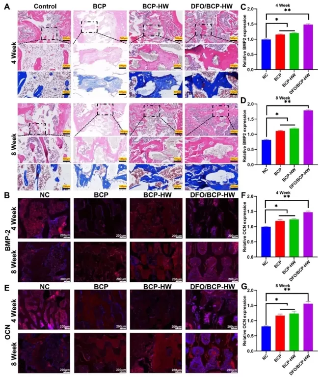 通过组织学染色和免疫荧光染色,观察不同植入物在骨质疏松大鼠股骨缺损处4周和8周后的组织再生情况以及BMP2和OCN的表达。结果表明,DFO/BCP-HW组在8周时骨结构最有序,与宿主组织整合最佳,BMP2和OCN表达在该组显著升高。