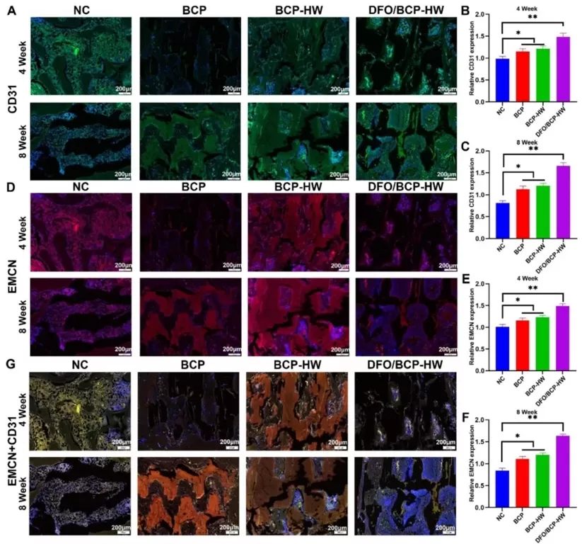 采用免疫荧光染色和定量分析,研究不同组在植入后4周和8周时血管内皮标记物CD31和EMCN的表达,以评估血管化程度和H型血管形成。结果显示,DFO/BCP-HW组在两个时间点的血管化相关指标均显著增强,8周时H型血管形成明显增加。