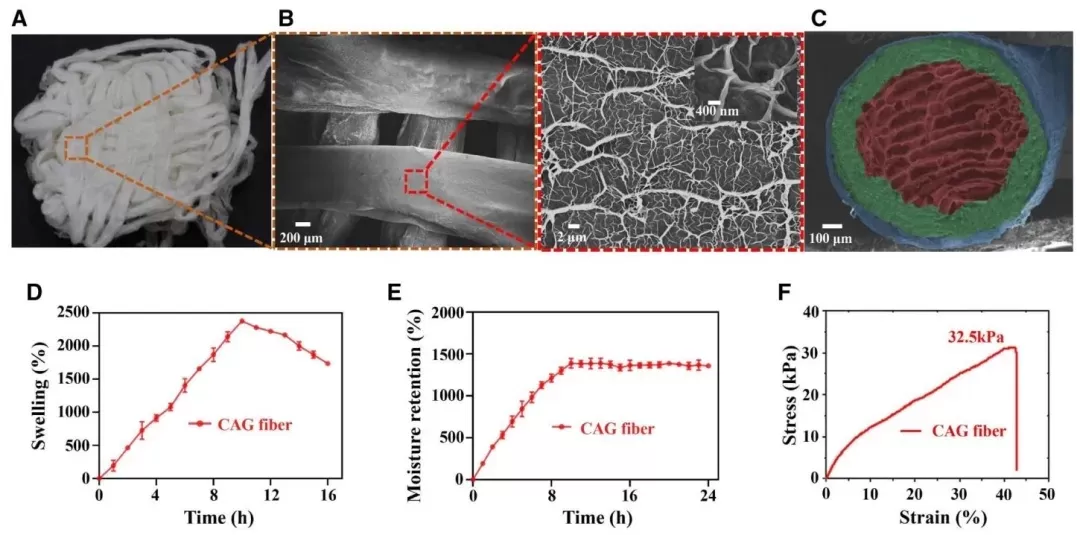 CAG纤维的微观结构和物理性质,通过场发射扫描电子显微镜(FE-SEM)观察、测量不同时间点纤维在特定溶液中的重量并计算相关比率、利用万能试验机进行拉伸测试等研究方法,研究了CAG纤维的微观结构、孔隙大小、各层结构、吸水保湿性能以及机械性能。结果表明,CAG纤维呈分层结构,有适宜的孔隙尺寸利于液体吸收和细胞活动,具备三层核壳结构,吸水膨胀率高(浸泡10h可达2378%)、保湿性好(保湿率达1388%),能满足伤口敷料的基本机械要求。