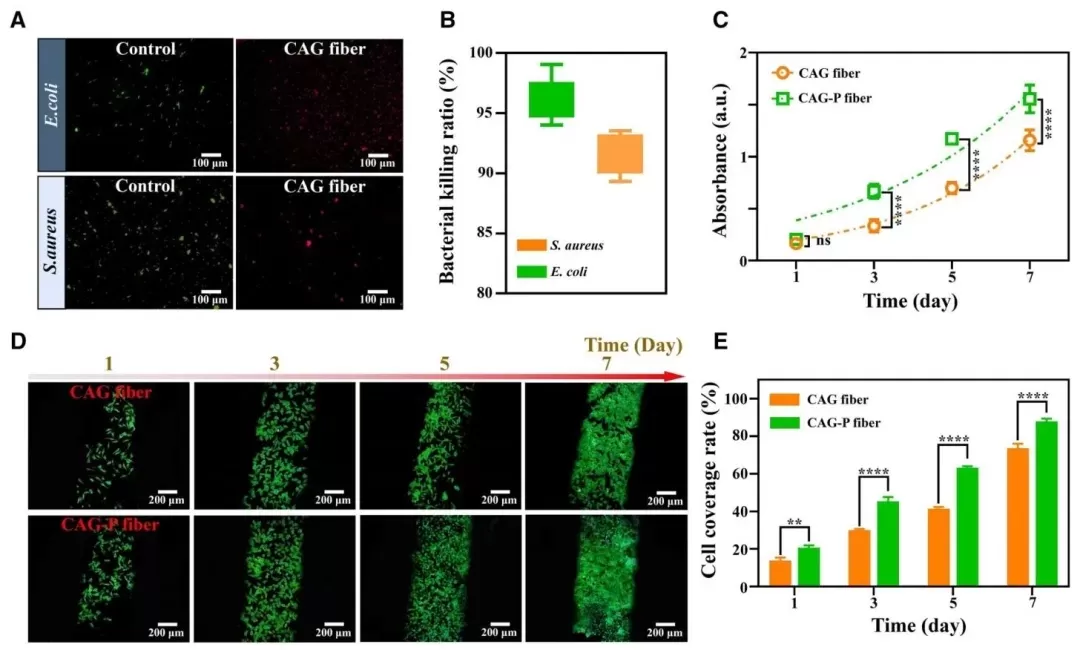 CAG-P纤维的体外抗菌性能和生物相容性,利用活/死染色法评估对大肠杆菌和金黄色葡萄球菌的抗菌性能、通过CCK-8法检测细胞增殖率以及荧光染色观察细胞覆盖情况等研究方法,研究了CAG-P纤维的抗菌能力和对L929细胞的生物相容性。结果表明,CAG-P纤维对两种细菌的杀菌率高(对金黄色葡萄球菌达96.32%,对大肠杆菌达91.56%),且生物相容性良好,能促进L929细胞增殖,第7天细胞覆盖率比对照组高14.18%。
