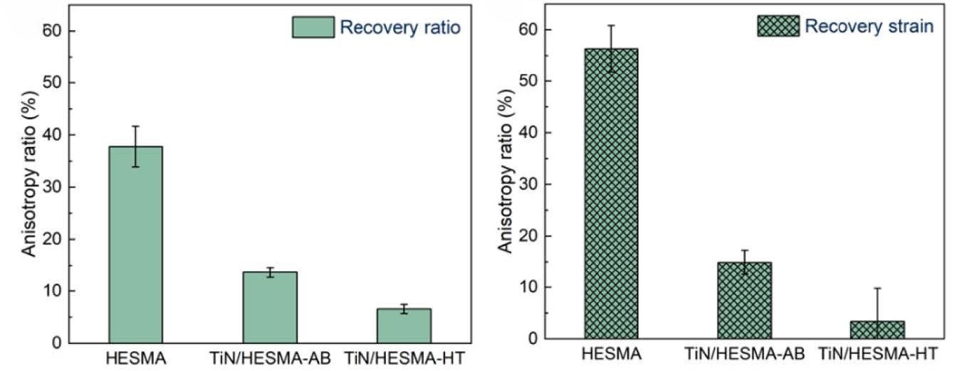 在未添加TiN的HESMA基体中,屈服强度在不同成型方向之间存在显著差异,水平方向样品的屈服强度达到582.5 MPa,而垂直方向样品的屈服强度为417.4 MPa。形状记忆性能也存在差异,垂直方向的最大回复应变达到6.3%,而水平方向的最大回复应变仅为4.0%。添加TiN纳米颗粒后,屈服强度分别提高至802.4 MPa(水平方向)和665.9 MPa(垂直方向)。屈服强度各向异性比从39.6%降低至20.5%。形状记忆各向异性进一步降低,最大回复应变差从56.3%降至14.9%。