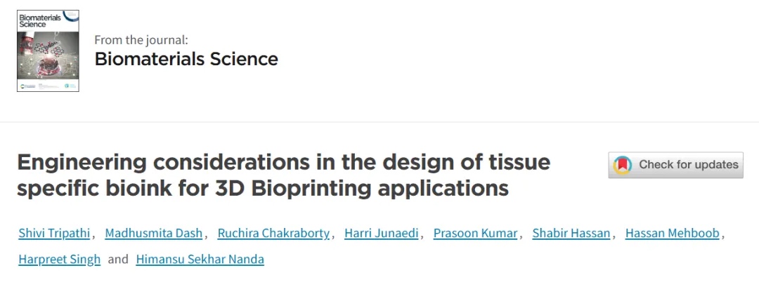 近期,印度信息技术设计与制造研究所Himansu Sekhar Nanda/印度理工学院Prasoon Kumar等通过提供用于创建适合骨骼、皮肤、软骨和肝脏组织3D生物打印的生物墨水的最新策略,填补了现有文献中未充分探索的挑战的空白。