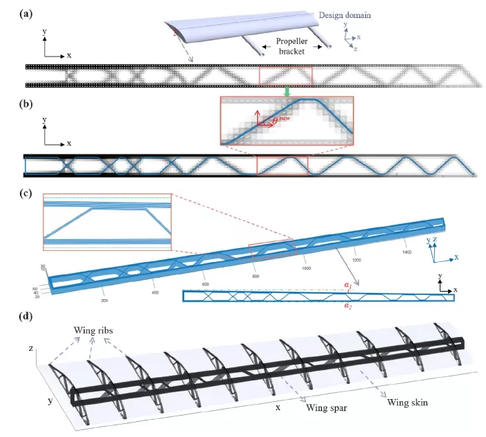 )光束,并与蜂窝光束的性能进行了对比,验证了其可行性和有效性。作为工业案例研究,将所提出的框架应用于无人机机翼翼梁并进行优化,如图3所示。然后,采用3D打印技术在CCFRC上制作了翼梁和翼肋的内部结构,并进行了实验测试和数值分析,验证了其承载能力。其中优化后的翼梁能够承受32.16倍于自重的垂直起飞工况下的工作载荷,并且机翼内部结构在飞行状态下具有较高的刚度。所提出的方法扩大了CCFRC的设计和制造自由度,具有革新制造的潜力,可在广泛的应用范围内显著提高性能和效率。