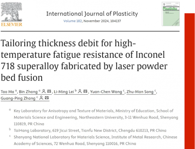 相关研究以“Tailoring thickness debit for high-temperature fatigue resistance of Inconel 718 superalloy fabricated by laser powder bed fusion”为题,在International Journal of Plasticity 182 (2024) 104137上进行了详细报道。论文第一作者为东北大学博士研究生马涛,通讯作者为东北大学张滨教授、太行实验室雷力明研究员和中国科学院金属研究所张广平研究员。