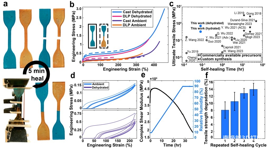 ± 0.49 MJ/m3,挑战了需要繁琐且昂贵的合成才能在可打印自愈材料中实现吸引人机械性能的观念。