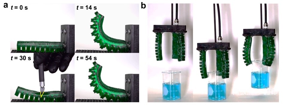 为展示这些材料适用于软体机器人应用,三个相同的执行器被连接到一个定制夹具上,形成一个三指抓持器(见图4b)。软体机器人抓持器放置在一个装满100