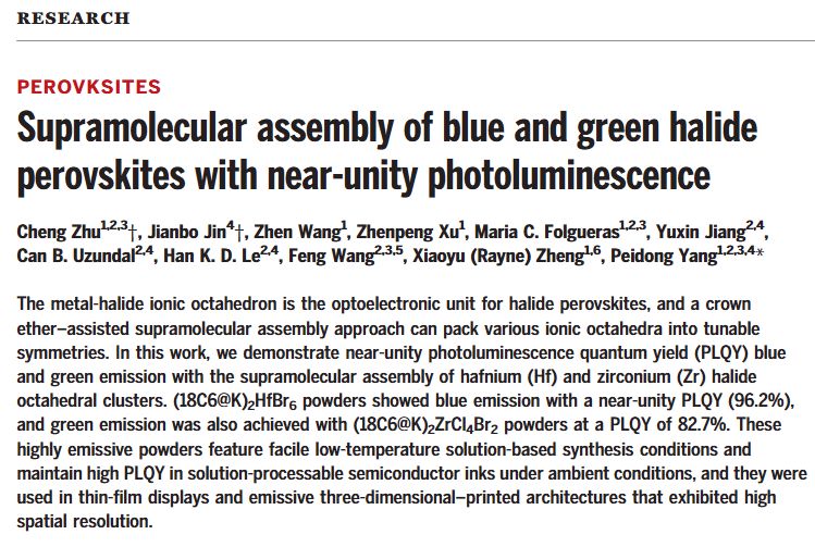2024年1月16日,来自加州大学伯克利分校材料科学与工程系、劳伦斯伯克利国家实验室材料科学部等的研究成员在光致发光领域取得突破,并借助3D打印技术制备了光致发光结构。他们的研究结构已经发表在了Science上,研究题目为Supramolecular assembly of blue and green halide perovskites with near-unity photoluminescence(具有近乎一致光致发光的蓝色和绿色卤化物钙钛矿的超分子组装)。