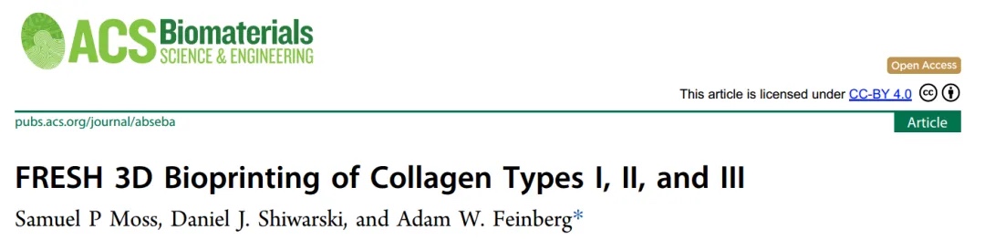 鉴于此, 来自卡耐基梅隆大学的Adam W. Feinberg教授团队开发了II、III型胶原蛋白以及组合生物墨水,通过FRESH 3D生物打印制造出具有微米级特征的毫米级支架,其保真度能够与已建立的I型胶原蛋白生物墨水制造的支架相媲美。