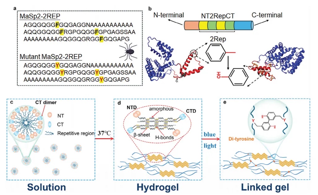 重组蜘蛛蛋白为创造新的生物材料提供了许多可能性。然而,它们的多态性和易于聚集的特性在其生产和实际应用中都提出了挑战。香港城市大学胡金莲院士及其团队报道,突变重组蜘蛛蛋白在37°C和可见光照射下可快速、可控地形成水凝胶。在突变蜘蛛蛋白中,苯丙氨酸残基(F)被(GGX)重复序列中的酪氨酸残基(Y)取代,这有助于β-sheet的自组装和进一步形成淀粉样纳米原纤维。胶束/球状蜘蛛蛋白溶液转化为由纳米原纤维网络组成的蜘蛛蛋白水凝胶,随后通过双酪氨酸进一步交联。通过光谱学、透射电子显微镜(TEM)和分子动力学模拟验证其构象转变过程。此外,蜘蛛蛋白水凝胶根据其良好的生物相容性、剪切减薄性能和纳米原纤维网络结构,被用作生物墨水和仿生细胞支架。本研究结果揭示了蜘蛛蛋白的结构转化机制,并扩展其在生物医学工程中的应用。
