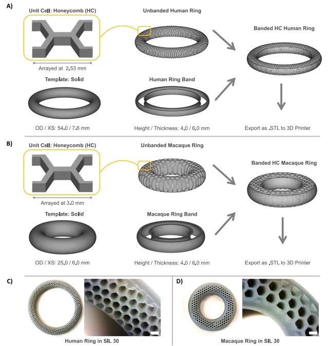 30树脂的蜂窝状宫内节育器(IVR)的内部结构,包括人类尺寸和猕猴尺寸的IVR设计,突出了它们的外部直径(OD)、横截面(CS)以及内部蜂窝几何结构,这些设计特征对于药物释放动力学和IVR的特定表面积(SSA)至关重要,从而确保了在不同尺寸的IVR之间可以实现药物加载和释放动力学的直接比较。