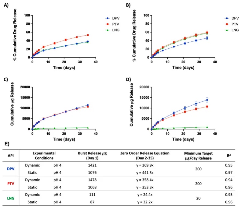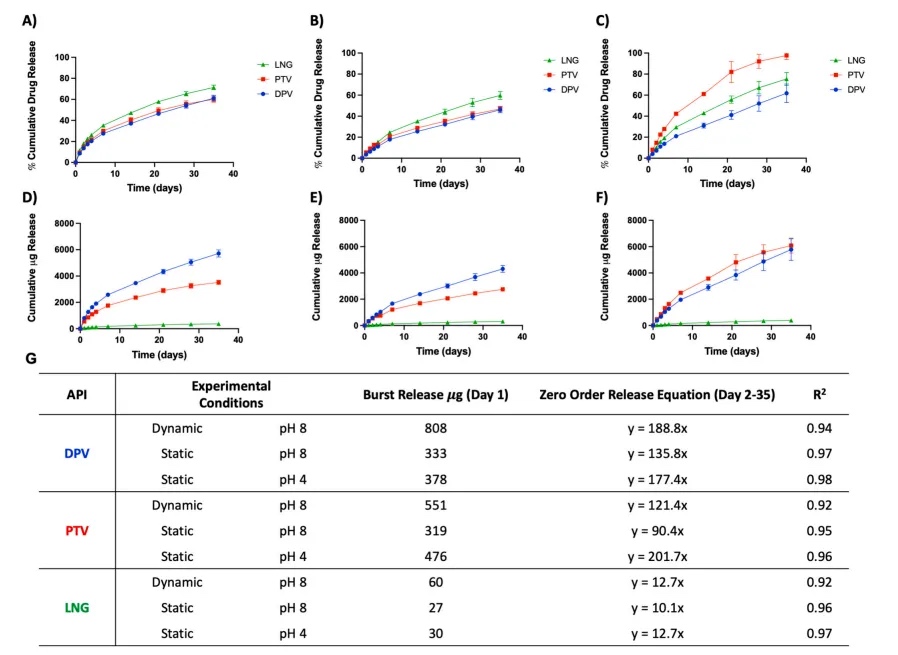 30蜂窝状猕猴尺寸宫内节育器(IVR)在35天内的体外药物释放动力学,包括每种活性药物成分(API)的累积百分比释放和累积微克药物释放,结果表明,无论pH值如何,IVR均表现出类似的释放曲线,且在动态条件下(pH