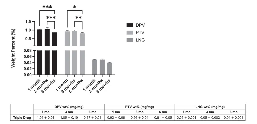 在4°C条件下储存1、3和6个月的IVR片段中三种活性药物成分(DPV、PTV和LNG)的重量百分比变化,结果显示所有三种API在储存3个月后保持稳定,但在6个月后重量百分比显著下降,表明了药物在储存过程中的稳定性和潜在降解情况,特别是对于PTV,其在与DPV或LNG组合时表现出更明显的降解。