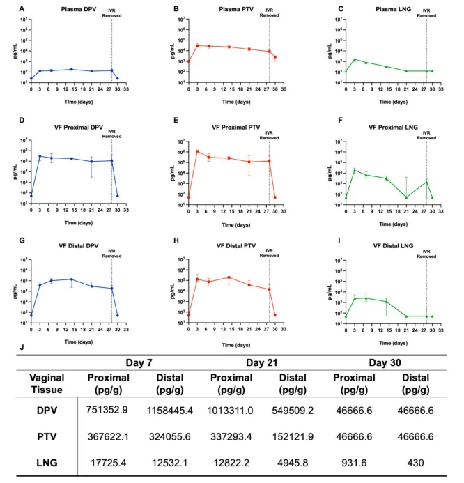 在猕猴模型中,携带DPV、PTV和LNG的多用途预防技术(MPT)IVR在体内使用28天后,三种药物成分在血浆、阴道液(宫颈近端和远端)以及阴道组织中的药物浓度变化,结果表明,所有APIs在28天的研究期间内保持了相对恒定的药物浓度,并且在IVR移除后两天,药物浓度降至低于定量限,证实了MPT
