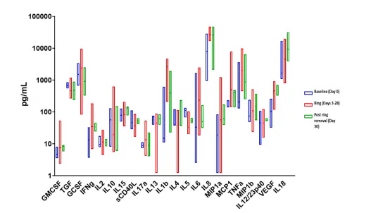 在猕猴中使用3D打印的多用途预防技术(MPT)宫内节育器(IVR)前后,22种阴道细胞因子和趋化因子的测量结果。这些测量结果在放置IVR之前(第0天)、IVR在位期间(第3至28天)以及IVR移除后(第30天)进行了比较。结果显示,在IVR放置期间或移除后,这些细胞因子和趋化因子的水平没有统计学上的显著变化,表明MPT