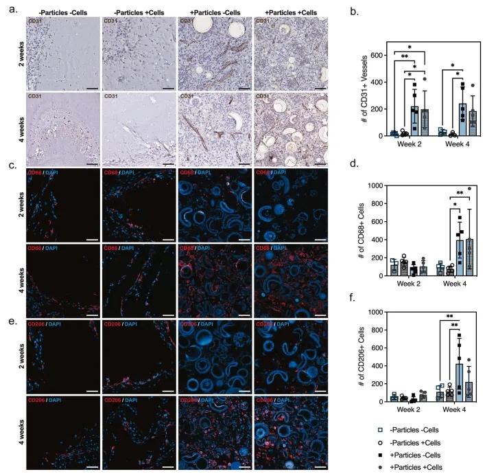 为进一步研究水凝胶支架的长期稳定性、结构完整性和功能,本文将体内的研究从最初的10天延长到2周和4周。第2周时取出的支架的总体形态图像显示,与不含颗粒的组相比,含有颗粒的支架显示出更小的支架面积(图7a和b)。本文推测这是由于细胞浸润增强和随后的材料降解,这在有颗粒存在的情况下更为显著。含有颗粒和接种细胞(ECs/DPSCs)的组中明显的证据表明,在总体形态上支架内血管化增加(图7a)。值得注意的是,尽管所有支架在解释时都保持完整,但组织学分析显示,缺乏颗粒的支架出现不稳定现象,在没有颗粒的支架中观察到明显的剪切和撕裂(图7c和d),并且不含颗粒的组中残留更多的水凝胶。
