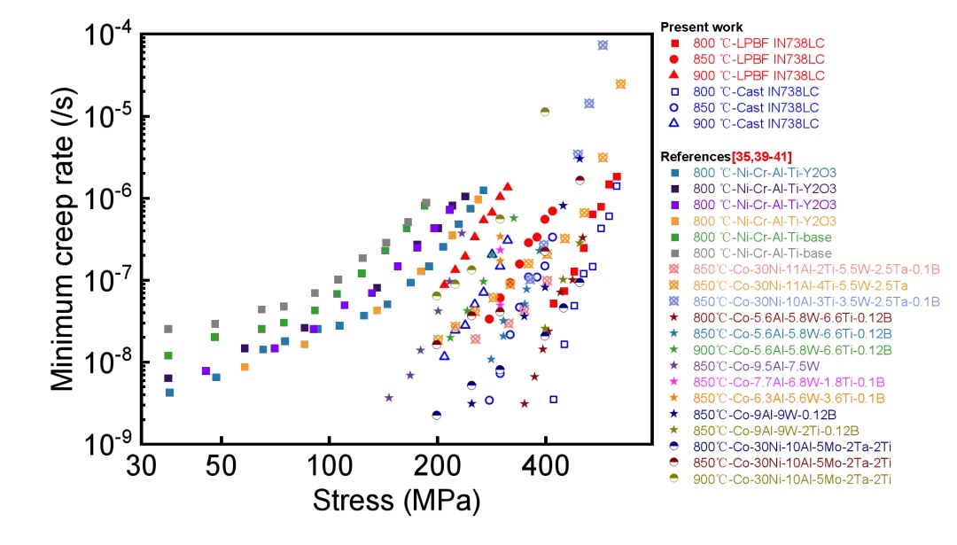 图3. LPBF-IN738LC合金(LIH处理态)与常用高性能高温合金(铸态)最小压缩蠕变速率对比
