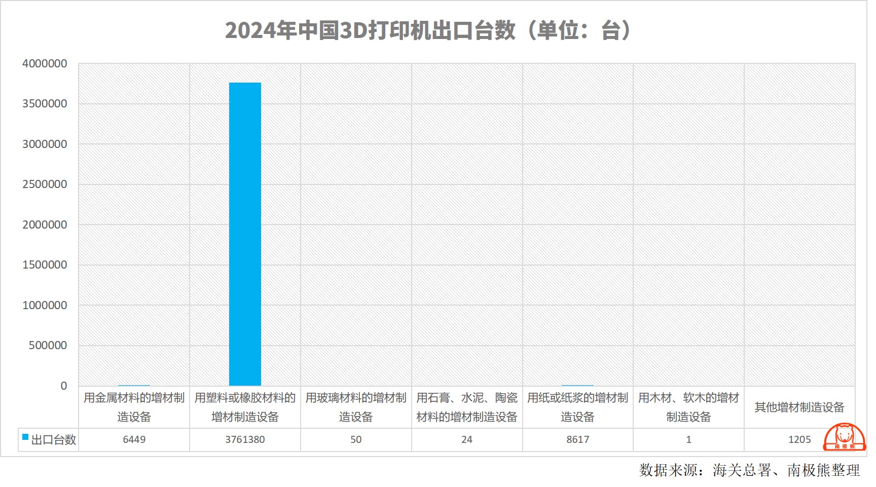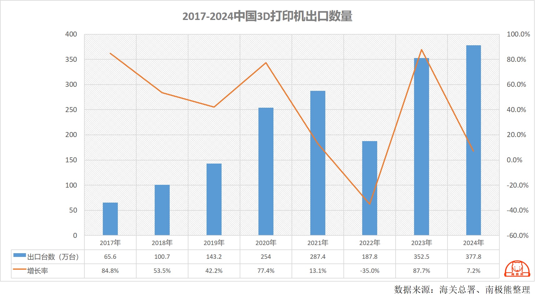 2025年1月21日,南极熊从海关总署查询到的数据显示,2024年中国出口3D打印机的数量为377.8 万台(不含零部件。),与2023年出口的352.5万台相比增长7.2%,增幅不是很大。