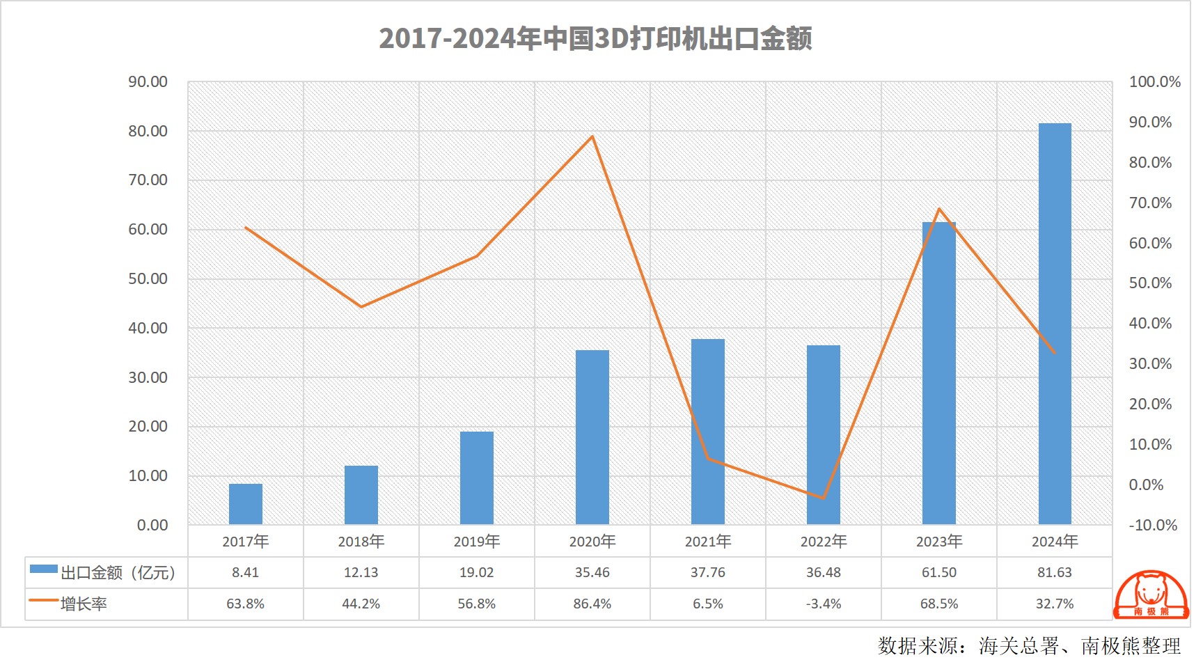 导读:最近两年,国产3D打印机的出口保持了增长,2024年已经结束,那么全年的3D打印机出口情况如何呢?