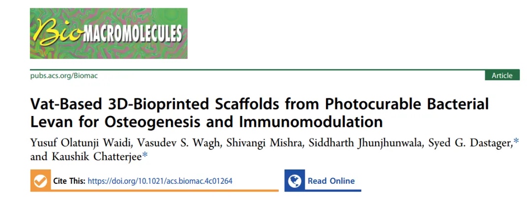 针对此问题,来自印度科学与工业研究理事会(CSIR)的Syed G. Dastager&印度科学研究所的Kaushik Chatterjee等人探索了细菌来源的甲基丙烯酸酯果聚糖(LeMA)作为生物墨水用于骨组织支架DLP打印的潜力。