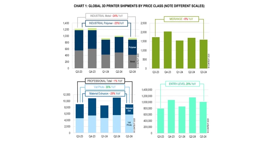 不过,也有一些希望的曙光闪现。根据CONTEXT的数据显示,专业级(2500美元至20000美元)价格区间的销售额仅略有下降(-1%),而入门级(低于2500美元)打印机的出货量则持续增长,同比增长达28%。在工业领域,尽管整体表现不佳,但部分供应商还是取得了亮眼的成绩。