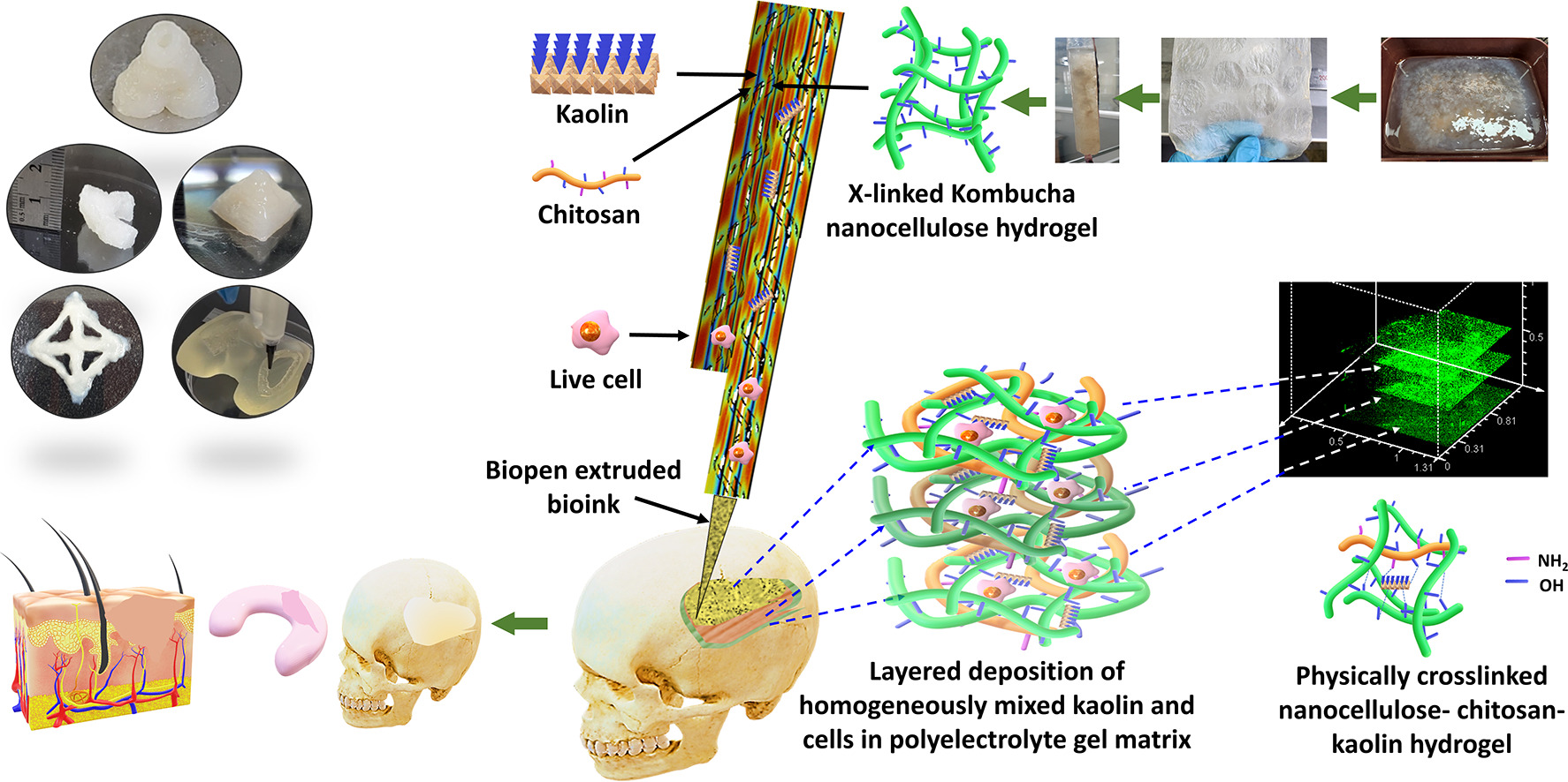 研究人员通过用乙酸部分水解纳米纤维素实现了这一目标——打破葡萄糖键并解开网络,使其具有生物可打印性。然而,这种处理方法缺乏对其特性的控制——导致其结构强度降低。该团队用壳聚糖(带正电)和高岭土(带负电)纳米颗粒增强了纳米纤维素。这些壳聚糖和高岭土颗粒通过静电力与纤维素相互作用——形成适合