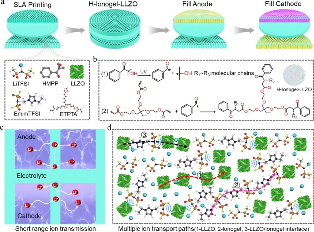 通过立体光刻(SLA)3D打印技术成功制造了具有蜂窝状结构的H-ionogel-LLZO固态电解质。这种独特的结构将平面电极/电解质接触转变为三维接触,显著增加了电极与电解质的接触面积,并将原本长且曲折的离子传输路径转变为短程传输路径,从而加速了锂离子的传输。同时,离子凝胶在LLZO纳米颗粒之间形成了低扩散势垒的界面,促进了锂离子在多尺度界面(包括陶瓷相、离子凝胶相和陶瓷/离子凝胶界面)之间的快速迁移。这些设计不仅提高了锂离子的传输效率,还增强了电池的电化学反应动力学,为高性能固态锂离子电池的开发提供了重要的材料基础(图1)。