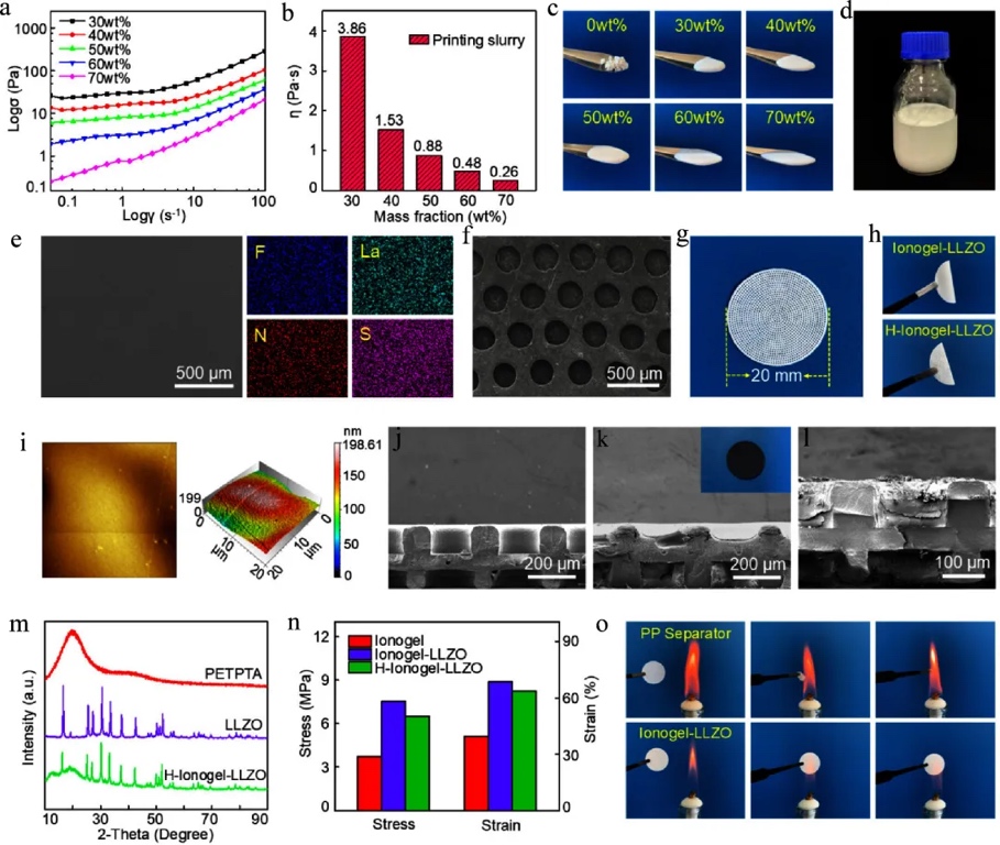 通过一系列实验对用于3D打印的浆料以及打印后的H-ionogel-LLZO固态电解质进行了全面的表征。通过流变学测试,发现随着离子液体(EmimTFSI/LiTFSI)含量的增加,浆料展现出更明显的剪切变稀行为,且在40