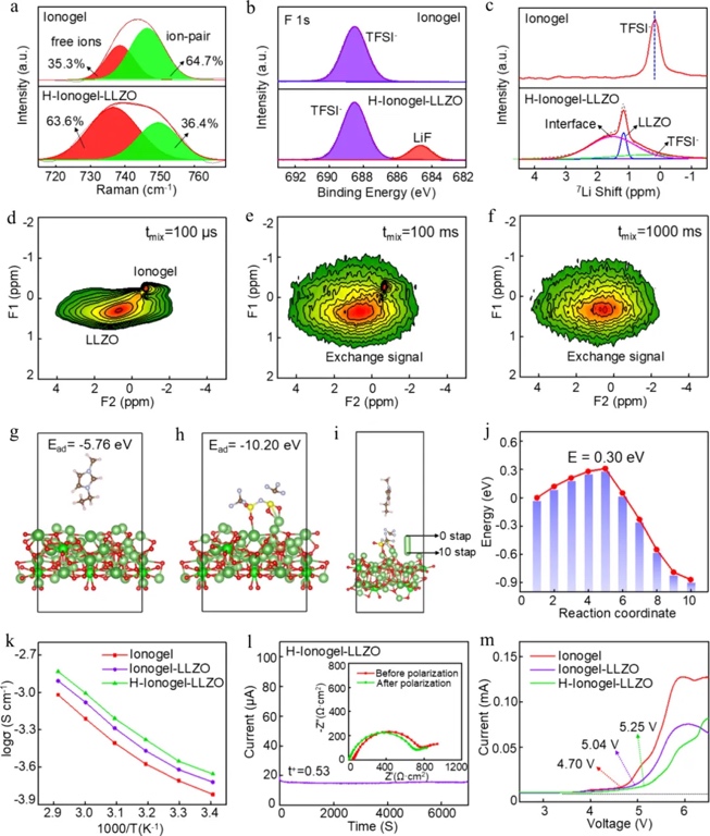 探讨了3D打印的H-ionogel-LLZO固态电解质中锂离子(Li+)的传输行为。通过拉曼光谱分析发现,与纯离子凝胶相比,H-ionogel-LLZO中自由TFSI-的含量显著增加,表明离子液体与LLZO纳米颗粒之间的强相互作用促进了LiTFSI的解离,从而产生了更多的自由移动的Li+。X射线光电子能谱(XPS)进一步确认了LLZO与TFSI-之间的化学相互作用,这种相互作用不仅提高了Li+的浓度,还在LLZO表面形成了低扩散势垒的界面,促进了Li+的快速迁移。固体核磁共振(NMR)和二维交换NMR谱揭示了Li+在陶瓷相、离子凝胶相以及两者界面之间的高效传输路径,表明Li⁺能够在异质界面之间快速交换。此外,基于第一性原理计算,研究者模拟了LLZO与离子液体之间的原子级相互作用,以及Li+在LLZO/离子液体界面的扩散路径和能量变化,发现Li+能够自发地跨越异质界面,形成快速离子传输通道(图3)。