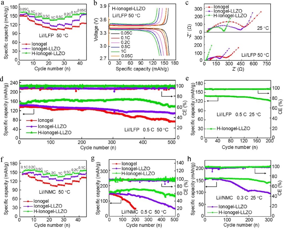 评估了使用H-ionogel-LLZO电解质的固态锂离子电池的倍率性能、循环稳定性和高电压兼容性。实验结果表明,这种电解质在不同倍率下均展现出优异的放电容量和恢复性能,特别是在0.05
