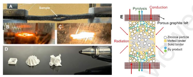 △快速热脱脂工艺;(A)-(C)在室温、中间温度(~ 1050°C)和高温(~ 1400°C)下工艺过程中拍摄的照片;(D)通过UFTD烧结的3YSZ复杂几何形状;(E)通过UFTD的脱脂机制的示意图。