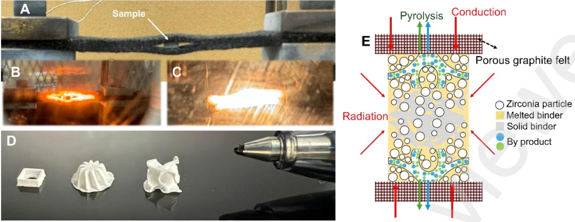 △超快热脱脂 (UFTD) 工艺。(A)-(C) 在室温、中温 (~1050°C) 和高温 (~1400°C) 下工艺过程中拍摄的照片; (D) 通过 UFTD 烧结 3YSZ 复合几何结构;(E)UFTD脱脂原理的示意图。