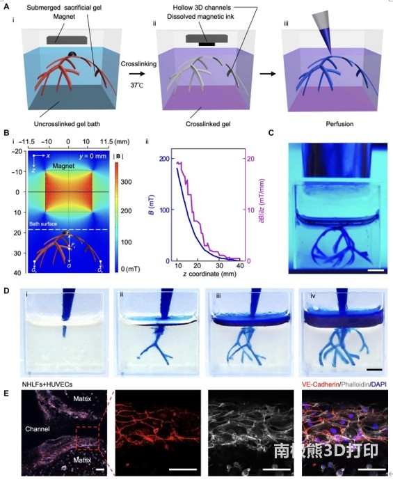 图 5. 磁驱动转化以创建具有3D分支维管通道的生物支架。(A)示意图显示了通过磁驱动转化策略制造具有3D分支维管通道的生物支架的步骤。(i)当施加磁体时,浸入未交联凝胶浴中的扁平牺牲明胶前驱体转化为3D几何形状。(ii)在紫外线下交联凝胶浴后,将交联支架置于37°C下,磁铁仍放在顶部,以溶解明胶并去除溶解的磁性墨水。(iii)显示生成的支架灌注的方案。(B)磁场分布分析。(i)施加磁体引起的磁场分布的有限元分析。(ii)沿z坐标的磁场分布。(C)牺牲前驱体转化为3D形态后支架的UV交联。(D)从(i)到(iv)演示的蓝色染料的支架灌注。(E)纤维蛋白支架中VE-钙粘蛋白(红色)、鬼笔环肽(灰色)和4',6-二脒基-2-苯基吲哚(DAPI)(蓝色)的免疫染色,其中HUVEC衬在通道壁上,NHLF在纤维蛋白基质内。