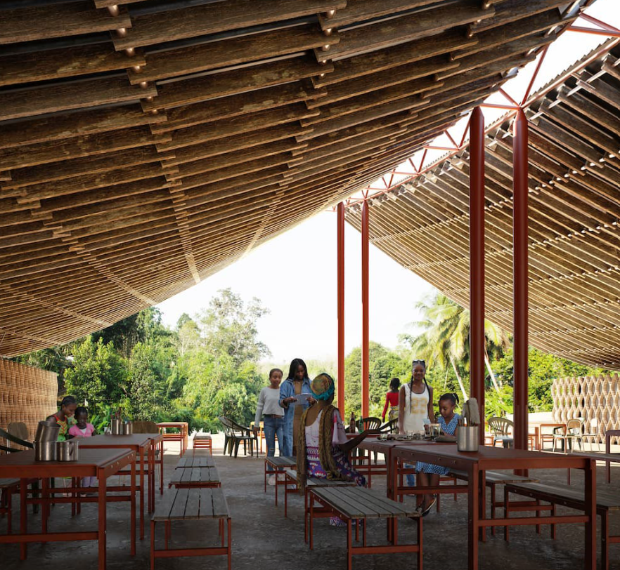 建筑设计的核心是纵横交错的 3D 打印土墙塑造结构,将传统建筑材料与数字制造技术融为一体。顶棚由短木段制成,由加泰罗尼亚高级建筑学院(IAAC) 和工程公司Eckersley O'Callaghan共同设计,形成了一个横跨主厅的宽阔屋顶。设计团队还直接与当地社区合作,在整个施工过程中提供就业和实践培训。每段木材连接在一起,形成一个灵活的编织状表面,覆盖在中央钢制脊柱上,提供结构支撑。波纹金属板包层增加了耐用性,同时保持了空间的开放性和吸引力。内部可移动的隔断使大厅可以在较小的房间和较大的公共空间之间切换,以适应不同的需求。