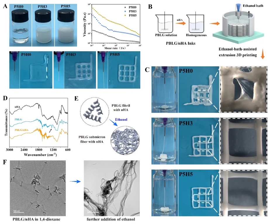 进一步,研究证实了即使是高浓度PBLG,非溶剂也可以诱导纤维结构形成,这为3D打印提供了可行性,因为往往挤出打印需要墨水浓度较高。在此基础上,将PBLG溶液与纳米羟基磷灰石nHA复合制备打印墨水。然而无论是PBLG溶液还是复合nHA的PBLG溶液都不具备可打印性。但是如果将乙醇作为接收相,即在乙醇中挤出,PBLG/nHA复合体系则具有优异的可打印性,并揭示nHA与PBLG之间的氢键相互作用促使溶于1,4-二氧六环中的PBLG和nHA混合物表现出优异的可挤出性、自支撑性和可塑性。同时为了兼顾可打印性和纤维结构的生成,研究对墨水组分进行了优化,实现墨水打印的同时同步生成仿生纤维结构。值得一提的是,纤维生成过程中,nHA与PBLG通过相互作用结合,不仅是对基质组成的仿生,也赋予打印材料优异的力学特性(36.59
