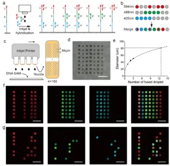 本研究提出了一种基于多色点阵的数据存储系统,该系统通过喷墨打印技术制作,由标记有不同荧光染料的DNA链构建而成。图2a展示了多DNA打印及杂交测试的设计方案,用于证明多种DNA链杂交的准确性。如图2b所示,可以通过不同波长的激光照射来对多色荧光点进行读取。图2c展示了喷墨打印的工艺流程。图2d展示了DNA微液滴打印与液滴融合的效果,图2e表明融合液滴数量与液滴半径立方呈正比关系。图f展示了多色打印测试中的荧光效果,图2g展示了图1b中所提到样例的实际效果。