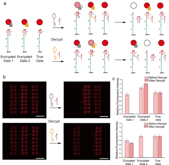 图3a为基于DNA链置换的加密与解密原理示意图。如图所示,特定干扰链仅能与正确的解密链发生链置换反应,从而被移除,而数据链在解密过程中得以保留。图3b为 DNA链置换解密的荧光点阵结果。图3c表示了DNA链置换解密相对荧光强度结果,以真实数据链强度为参考值。该结果表明,只有特定的解密链才能够移除对应干扰链,而数据链不受影响。