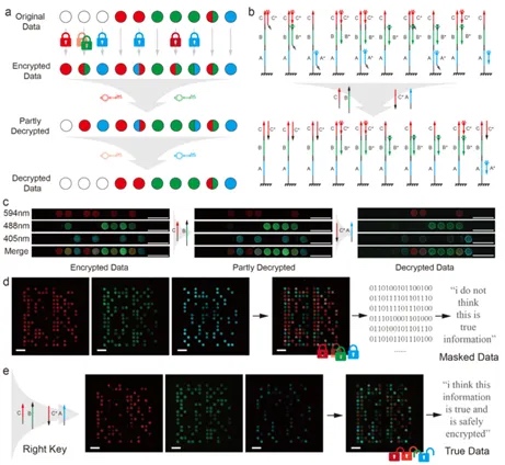 为了验证链置换加密系统的有效性,本研究提出了一种结合了并行与顺序加密的加密方法。如图5a所示,干扰链被加入了空白点位、单一红色点位和单一绿色点位中以加密。图5b则展示了加密所使用的DNA结构。图5c中的荧光显微镜显示,随着解密链按顺序加入,干扰荧光点被移除,最终只留下数据荧光点。如图d所示,没有解密时,荧光阵列产生了被遮蔽的数据。如图e所示,应用正确的解密链后,荧光信号即被解码为真实数据。