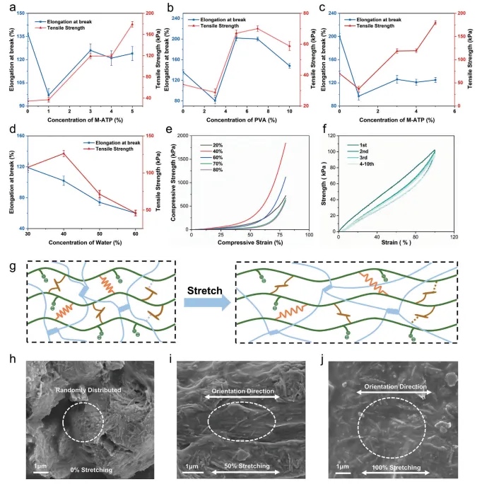 通过调整M-ATP(改性凹凸棒土)含量、PVA(聚乙烯醇)含量、水含量以及它们之间的相互作用来优化离子导电水凝胶的机械性能。实验结果表明,当M-ATP含量为5wt%,PVA含量为7wt%,水含量为40%时,水凝胶展现出最佳的综合机械性能,包括提高的拉伸强度和延展性。此外,通过结构设计,还制备了超出水凝胶应变限制的应变传感器,并证明了水凝胶在循环拉伸测试中具有良好的循环稳定性,这对于开发可穿戴应变传感器具有重要意义。