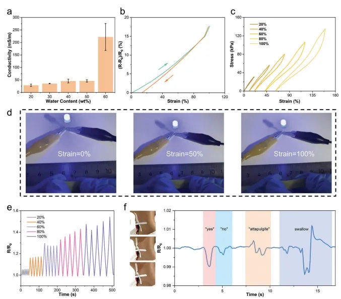 改性凹凸棒土增强的离子导电水凝胶的电学性能,包括其在不同含水量下的导电性、在拉伸过程中的电阻变化、以及在循环拉伸中的应变传感性能。实验发现,水凝胶的导电性随着含水量的增加而提高,且在0%至90%的应变范围内具有线性响应,表现出良好的应变传感特性。此外,利用这些水凝胶制造的生物传感器能够检测人体喉结的运动,如在说话和吞咽过程中的上下移动,显示出在生物传感领域应用的潜力。