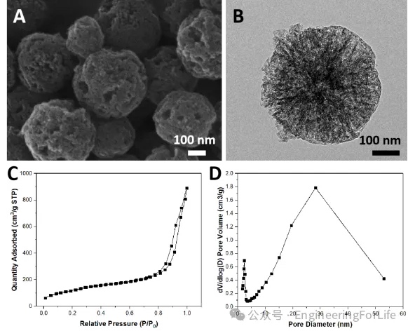 MBG是由许多纳米级别的小颗粒堆积组合形成的微球,玻璃微球分散性好,表面疏松多孔,孔道呈树枝状分布。MBG的N2吸附脱附曲线符合介孔材料的IV型等温线,经过计算可得出生物活性玻璃微球的比表面积为457.14m2/g,孔体积为1.38cm3/g,平均孔径为11.83nm。